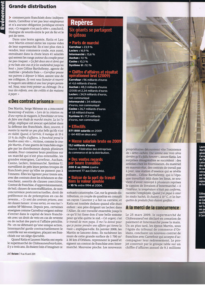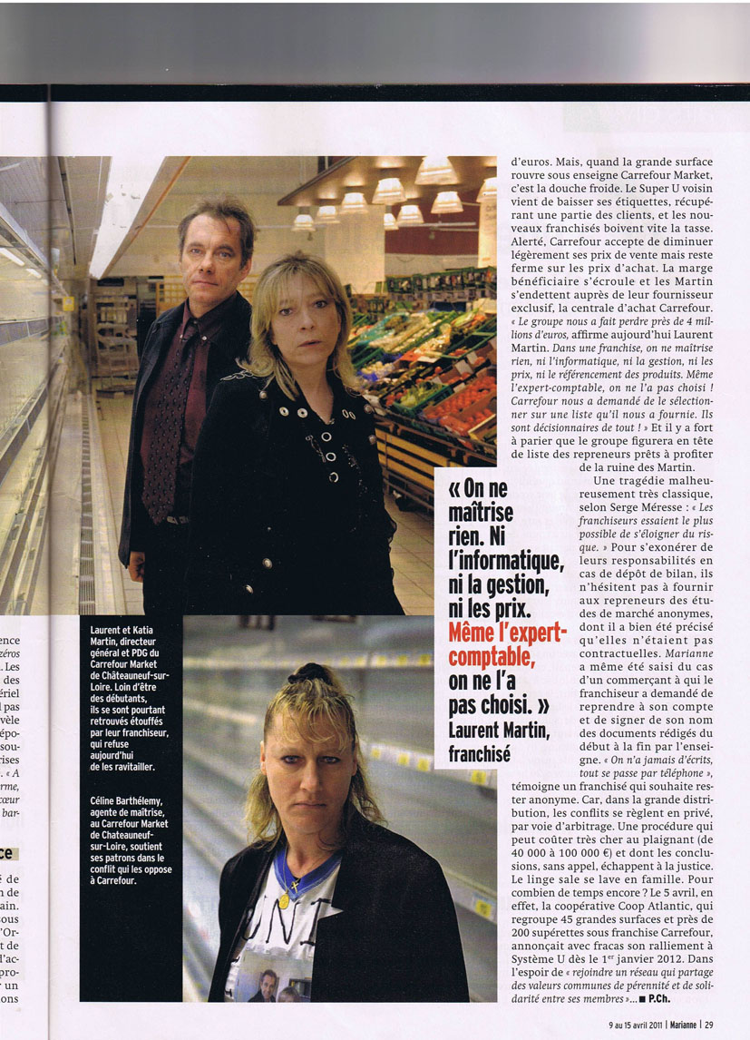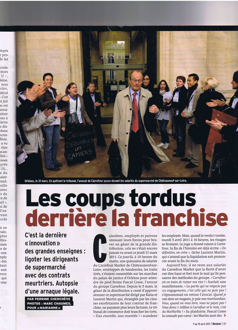 En préambule de son article, « Les coups tordus derrière la franchise », paru dans le magazine Marianne n°729 du 9 avril au 15 avril 2011, Perrine CHERCHEVE écrit : « C’est la dernière « innovation » des grandes enseignes : ligoter les dirigeants de supermarché avec des contrats meurtriers. Autopsie d’une arnaque légale. »